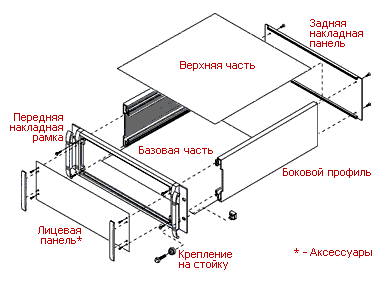Корпус состоит из основания, верхней и задней стенок, боковин, передней рамки и набора винтов для крепления передней панели. |